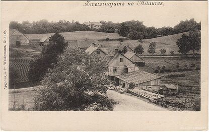 Ieteicamais nosaukums: Nītaure. Vēsturiskais centrs (nevis Sweizinajums no Nitaures) Anotācija: No attēlā redzamajām ēkām saglabājusies tālumā redzamā baltā ēka – muiža –, tagad vidusskola, un viena no ēku pudurīša, tagad "Īsoņi". Uz atklātnes teksts: “Sweizinajums no Nitaures.”